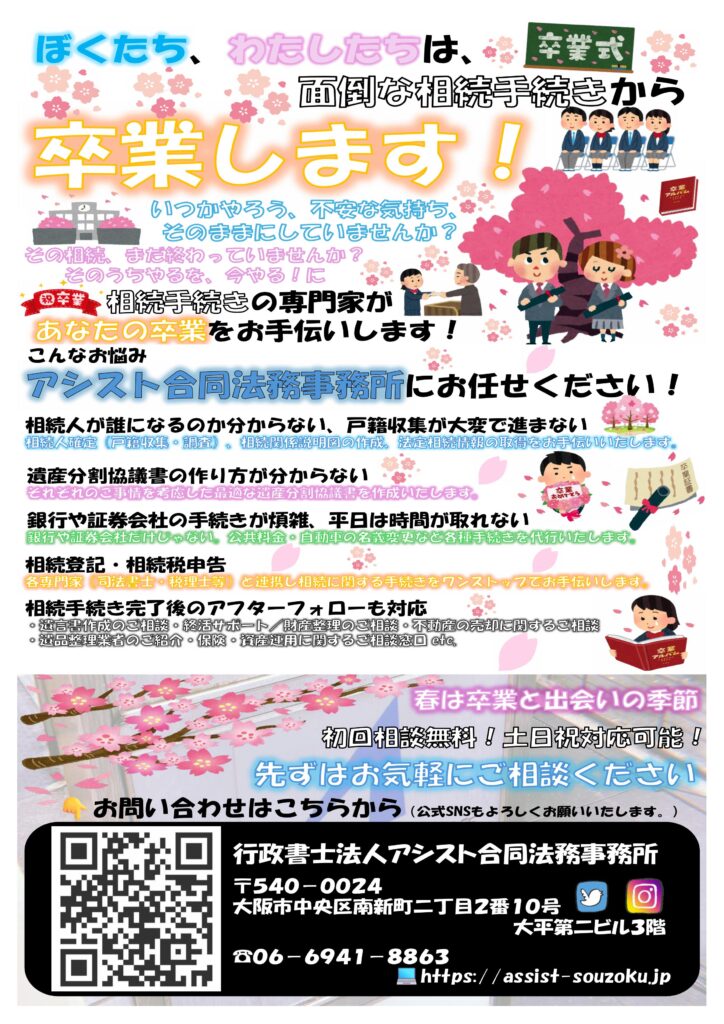 この春、アシスト合同法務事務所と、面倒な相続手続きから卒業してみませんか🌸